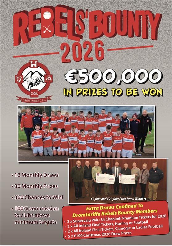 Each month, 30 prizes are drawn, ranging from €250 to €20,000, with a December first prize of €100,000. In addition, Dromtariffe Rebels Bounty Members are entered into some exclusive Club draws with very valuable prizes on offer.